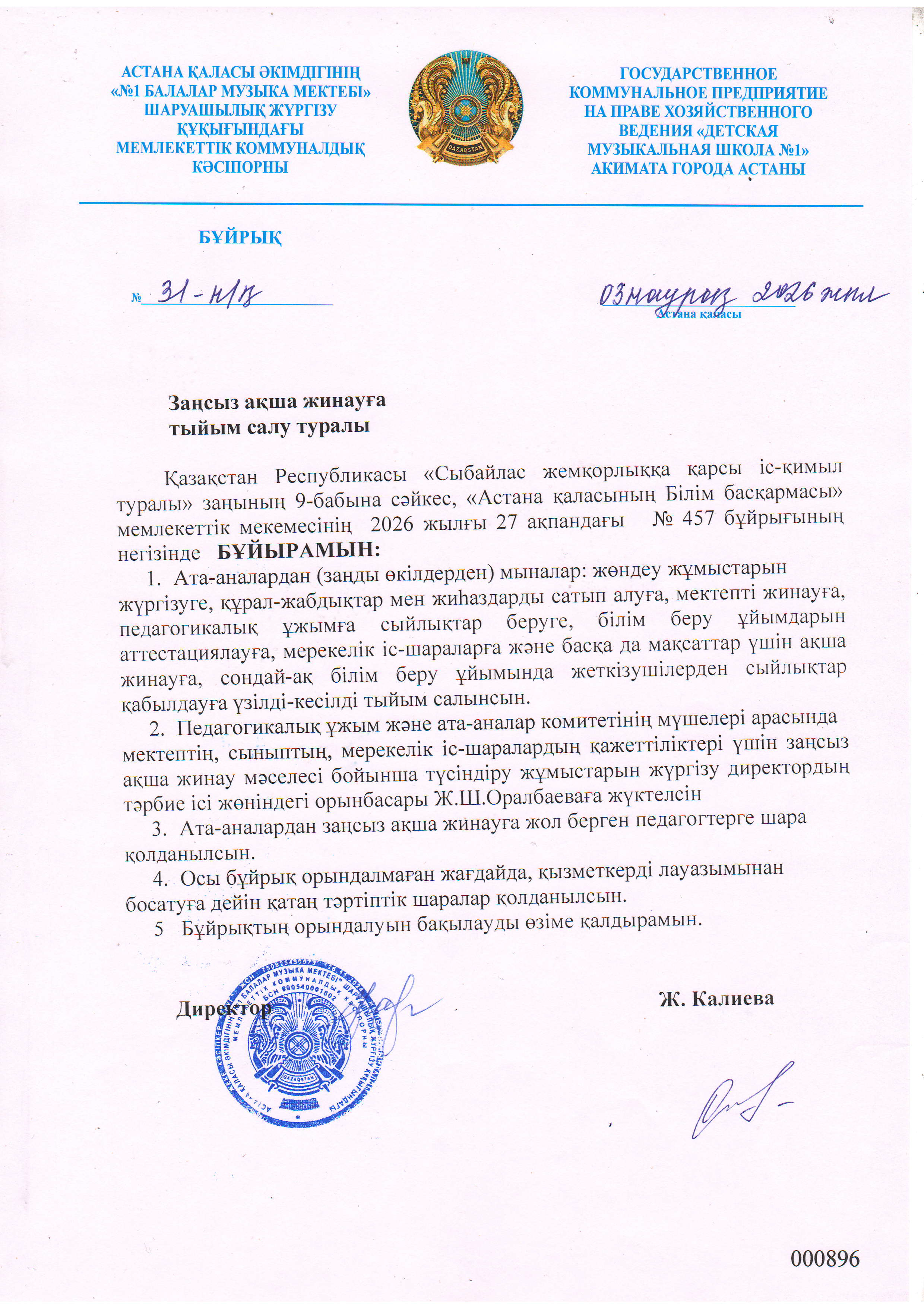 "Nº1балалар музыка мектебі" ШЖК МКК директоры Калиева Жанар Сериковна.