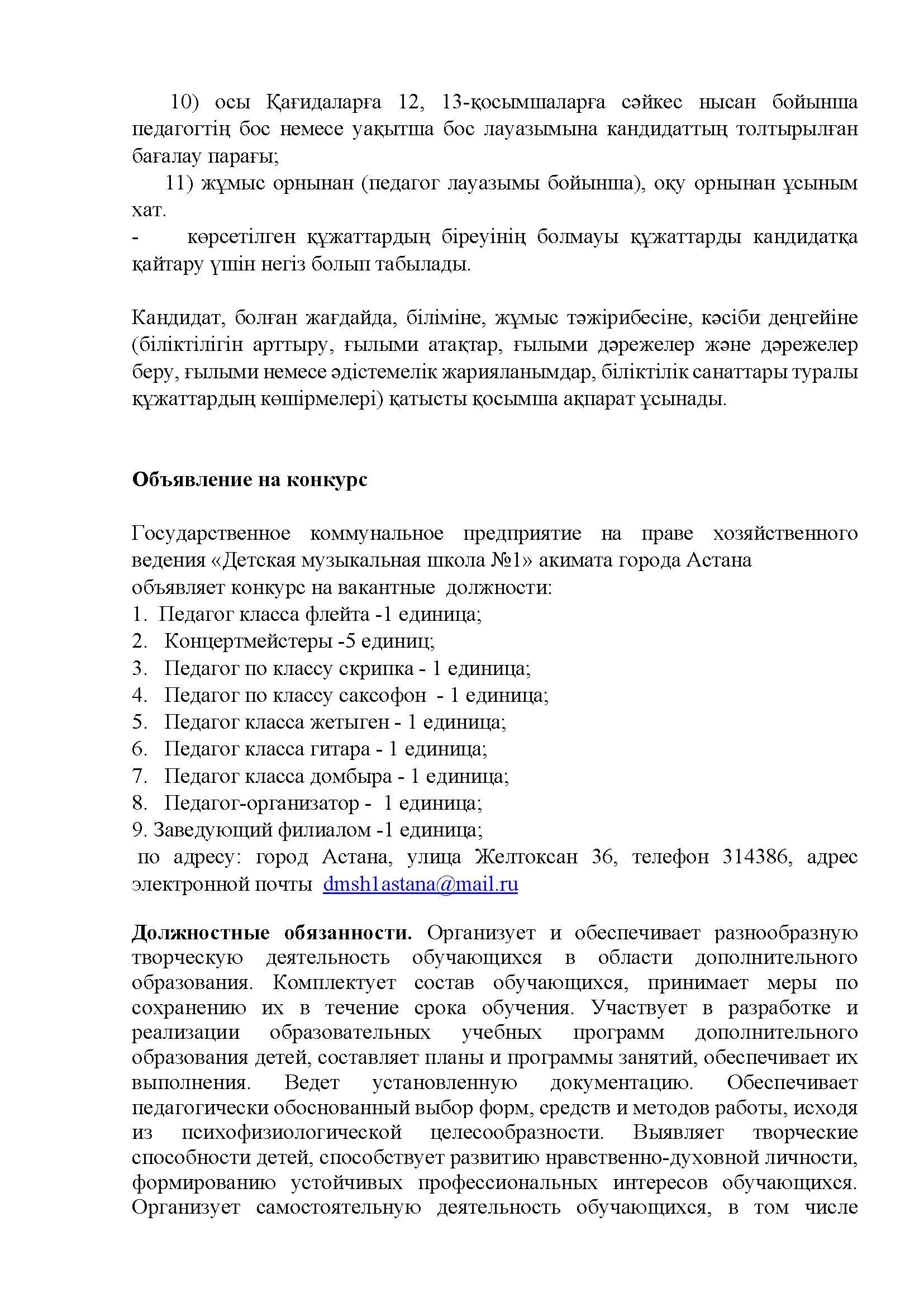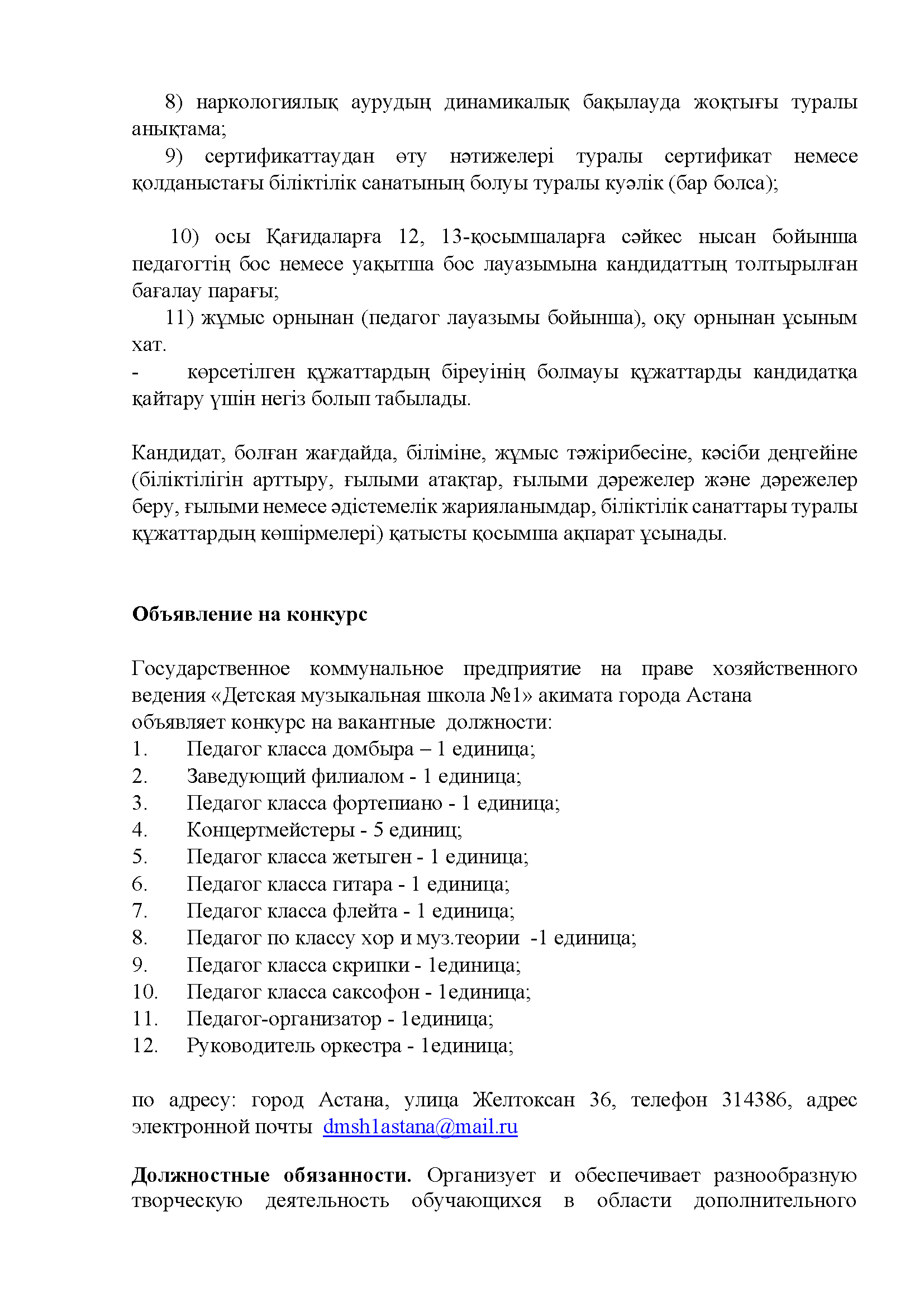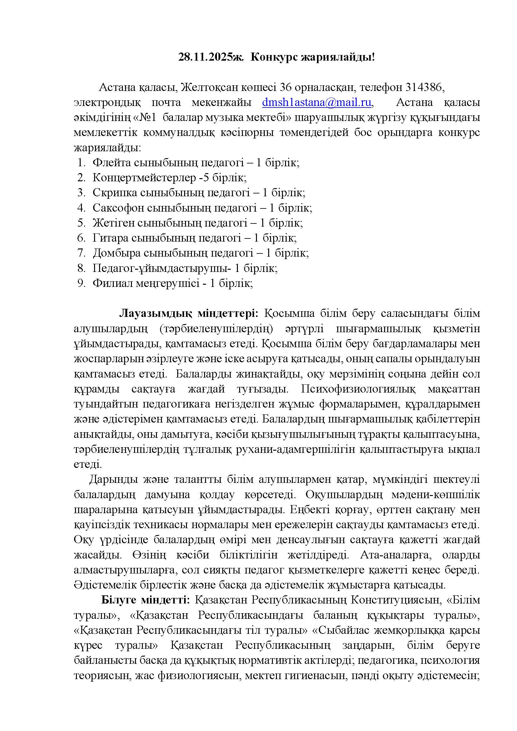 электрондық почта мекенжайы Адрес электронной почты защищен от спам-ботов. Для просмотра адреса в вашем браузере должен быть включен Javascript., Астана қаласы әкімдігінің «№1 балалар музыка мектебі» шаруашылық жүргізу құқығындағы мемлекеттік коммуналдық кәсіпорны төмендегідей бос орындарға конкурс жариялайды: