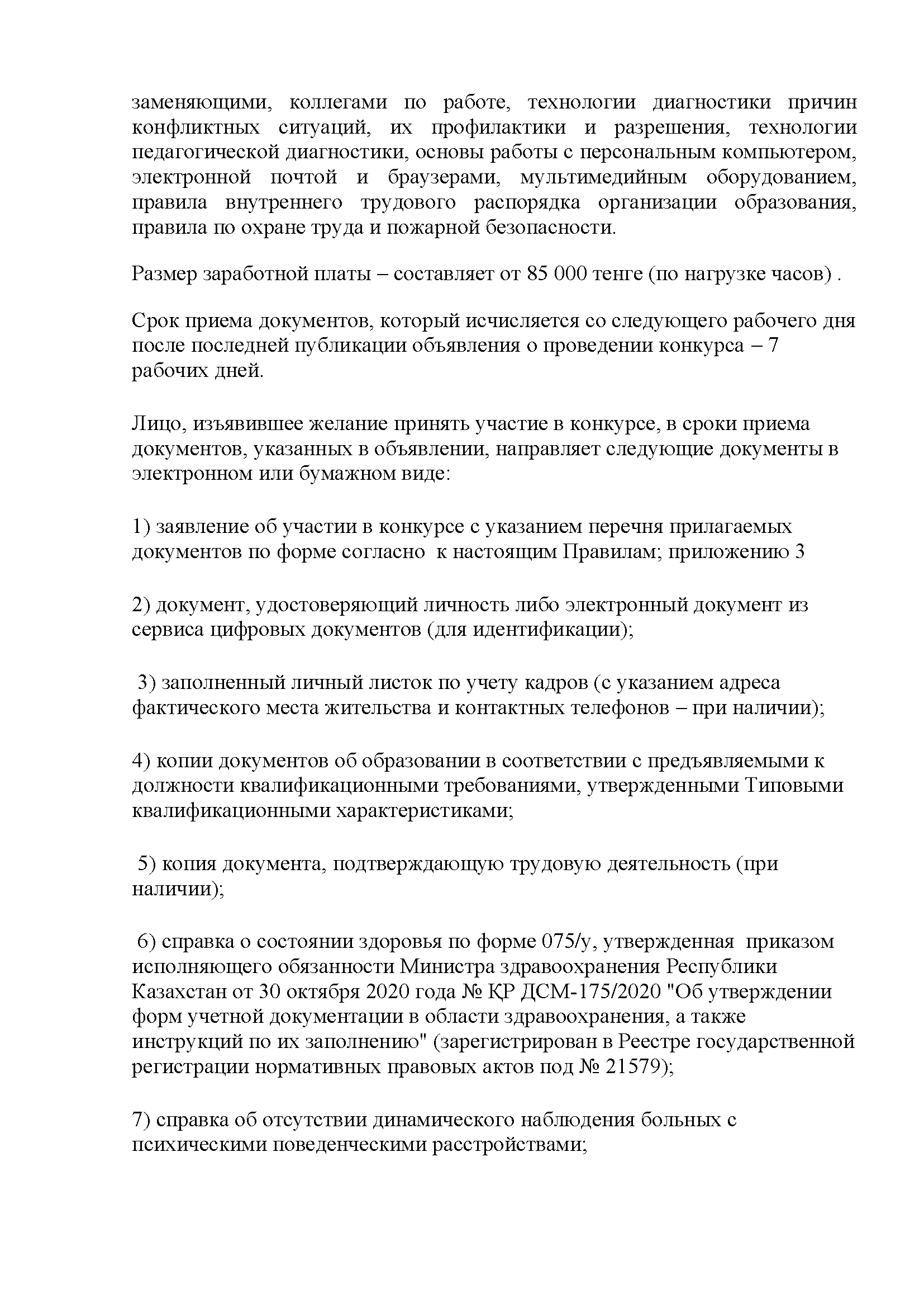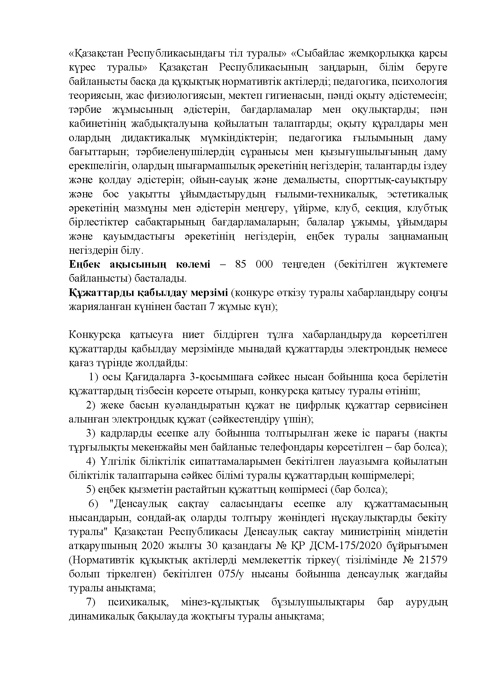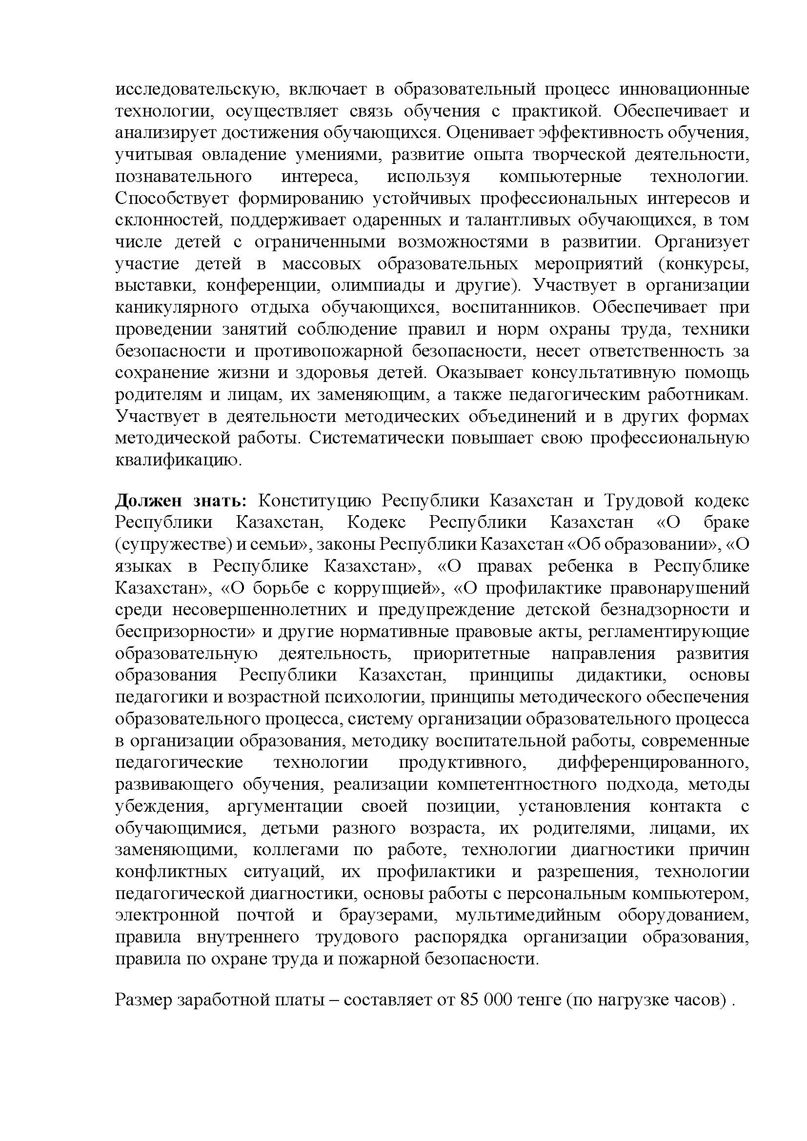 Размер заработной платы – составляет от 85 000 тенге (по нагрузке часов) .