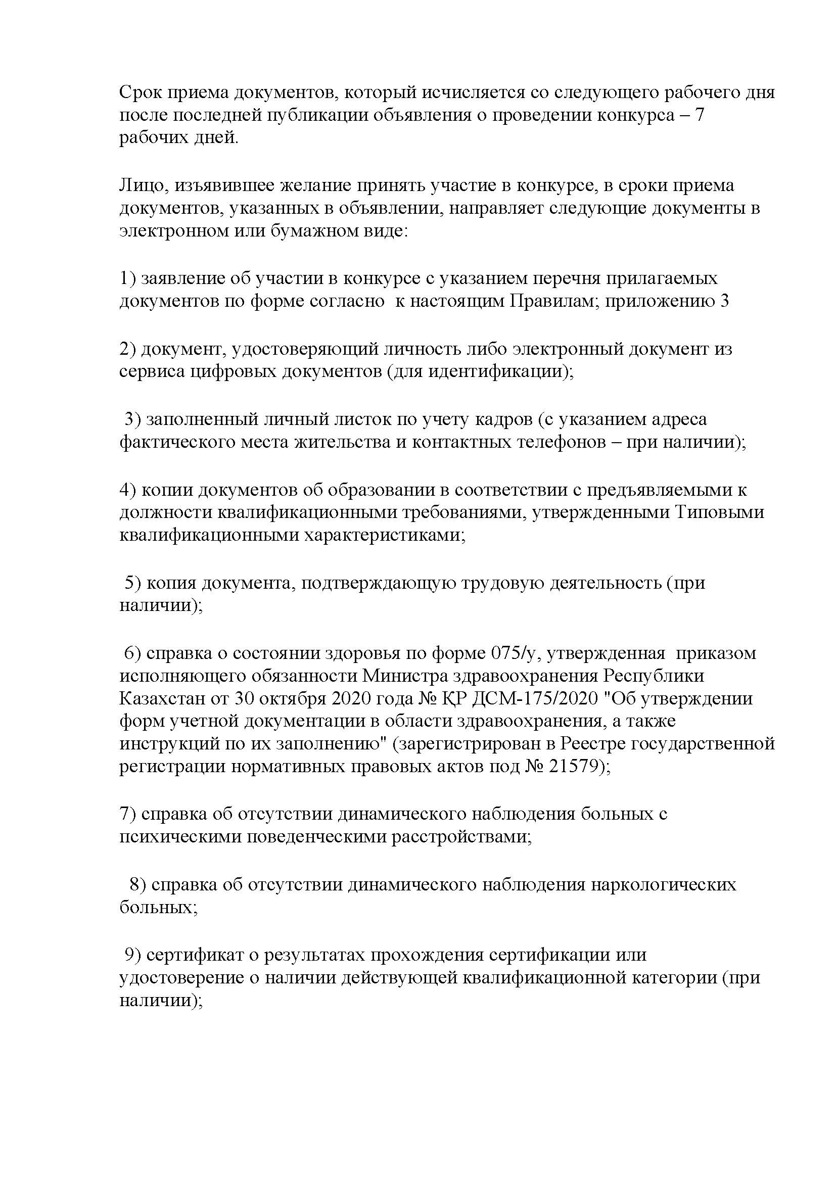 Құжаттарды қабылдау мерзiмi (конкурс өткiзу туралы хабарландыру соңғы жарияланған күнінен бастап 7 жұмыс күн);
