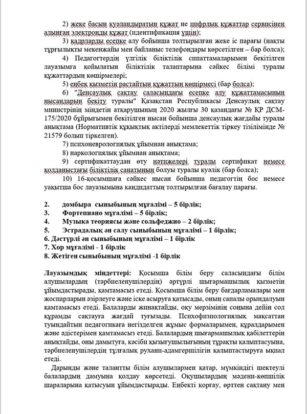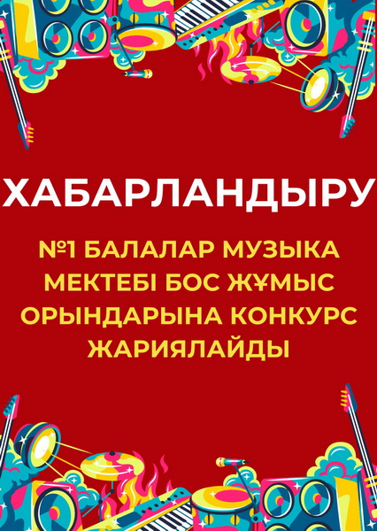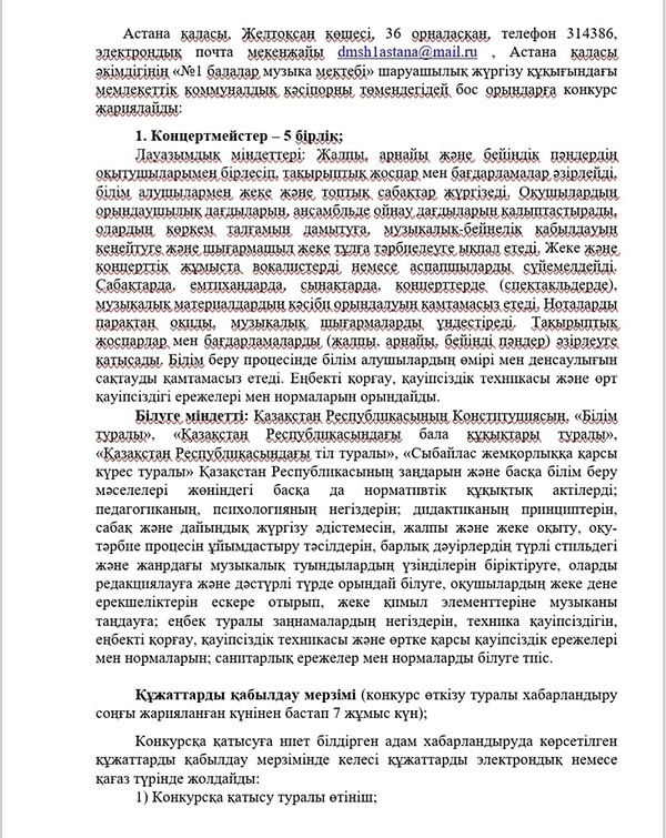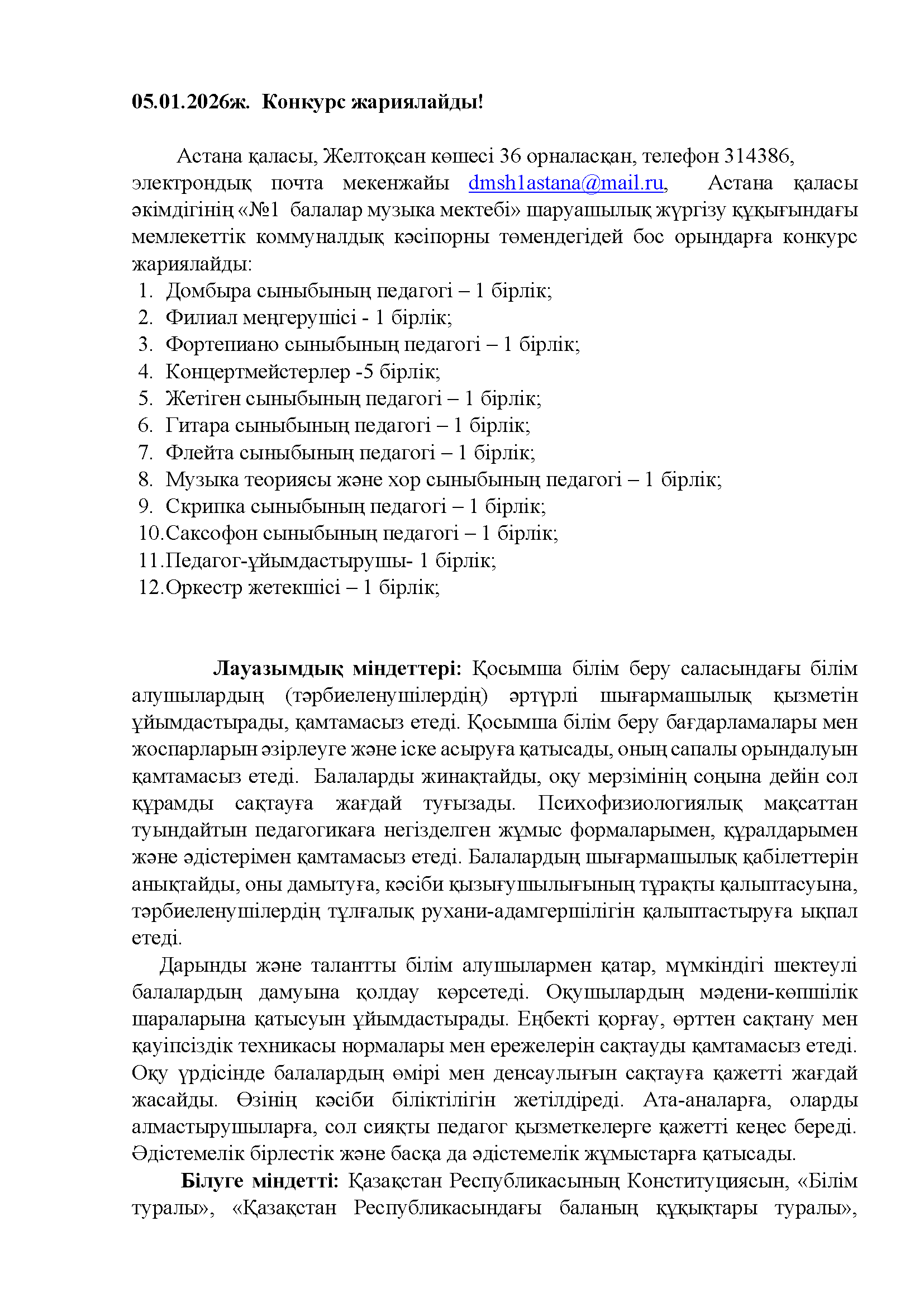 ? №1 Балалар музыка мектебі бос жұмыс орындарына конкурс жариялайды.