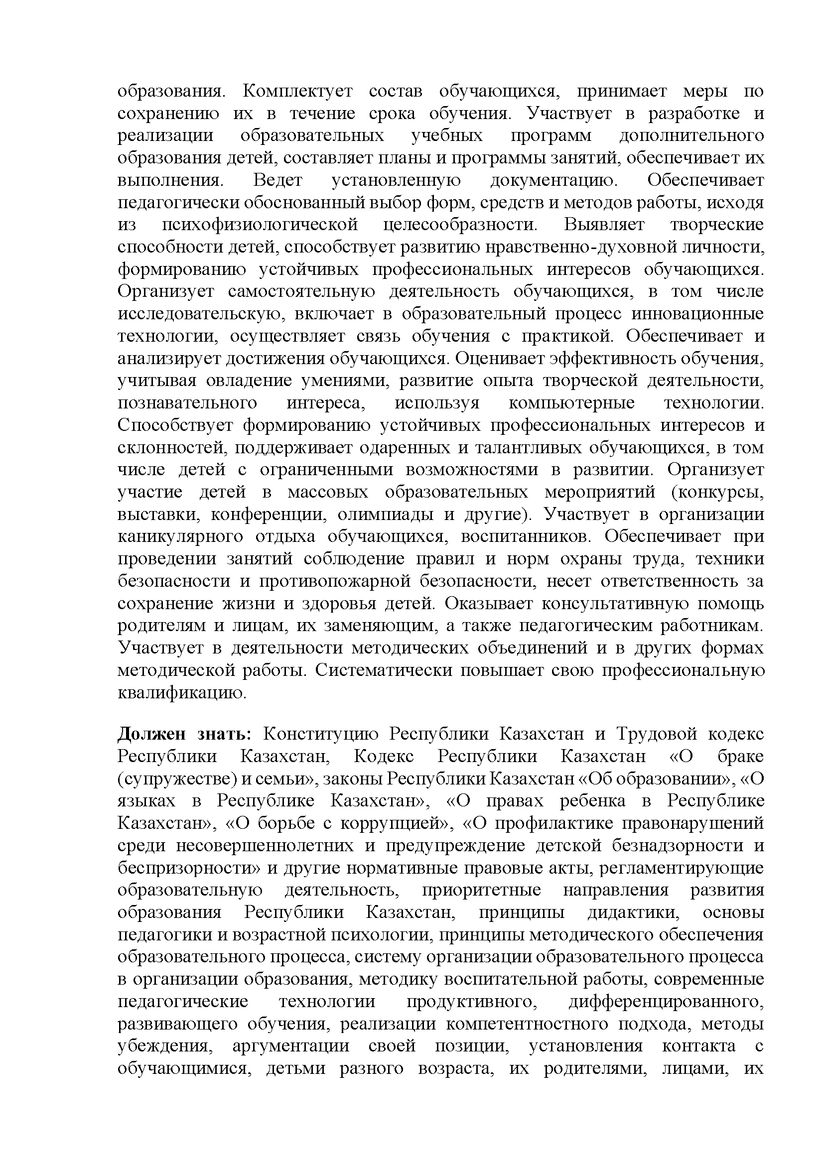Лауазымдық міндеттері: Қосымша білім беру саласындағы білім алушылардың (тәрбиеленушілердің) әртүрлі шығармашылық қызметін ұйымдастырады, қамтамасыз етеді. Қосымша білім беру бағдарламалары мен жоспарларын әзірлеуге және іске асыруға қатысады, оның сапалы орындалуын қамтамасыз етеді. Балаларды жинақтайды, оқу мерзімінің соңына дейін сол құрамды сақтауға жағдай туғызады. Психофизиологиялық мақсаттан туындайтын педагогикаға негізделген жұмыс формаларымен, құралдарымен және әдістерімен қамтамасыз етеді. Балалардың шығармашылық қабілеттерін анықтайды, оны дамытуға, кәсіби қызығушылығының тұрақты қалыптасуына, тәрбиеленушілердің тұлғалық рухани-адамгершілігін қалыптастыруға ықпал етеді.