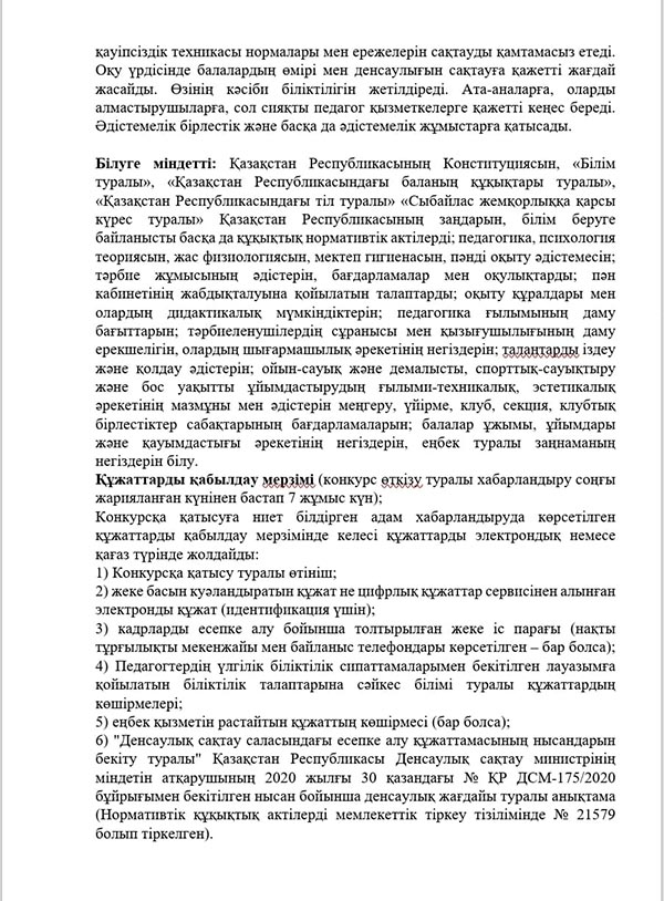 Должен знать: Конституцию Республики Казахстан и Трудовой кодекс Республики Казахстан, Кодекс Республики Казахстан «О браке (супружестве) и семьи», законы Республики Казахстан «Об образовании», «О языках в Республике Казахстан», «О правах ребенка в Республике Казахстан», «О борьбе с коррупцией», «О профилактике правонарушений среди несовершеннолетних и предупреждение детской безнадзорности и беспризорности» и другие нормативные правовые акты, регламентирующие образовательную деятельность, приоритетные направления развития образования Республики Казахстан, принципы дидактики, основы педагогики и возрастной психологии, принципы методического обеспечения образовательного процесса, систему организации образовательного процесса в организации образования, методику воспитательной работы, современные педагогические технологии продуктивного, дифференцированного, развивающего обучения, реализации компетентностного подхода, методы убеждения, аргументации своей позиции, установления контакта с обучающимися, детьми разного возраста, их родителями, лицами, их заменяющими, коллегами по работе, технологии диагностики причин конфликтных ситуаций, их профилактики и разрешения, технологии педагогической диагностики, основы работы с персональным компьютером, электронной почтой и браузерами, мультимедийным оборудованием, правила внутреннего трудового распорядка организации образования, правила по охране труда и пожарной безопасности.