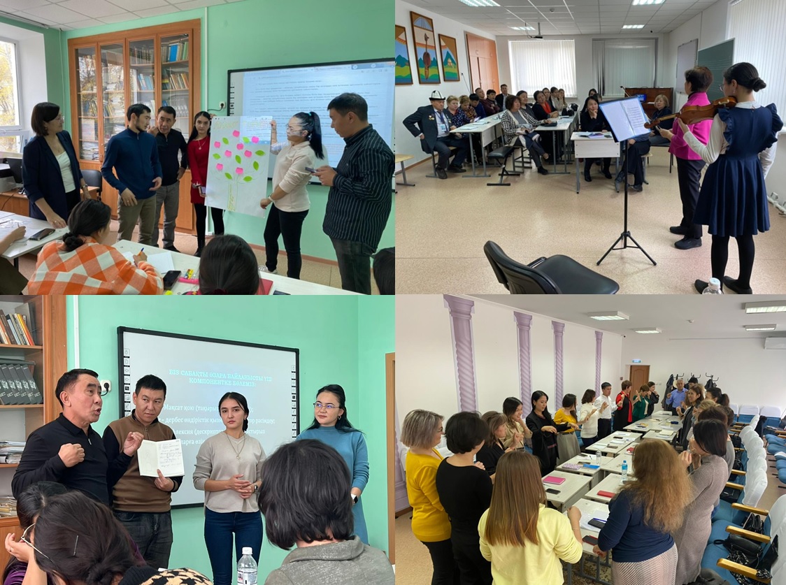 2022 жылдың 17-29 қазан аралығында мектебімізде ҚР Оқу-ағарту министрлігінің Республикалық қосымша білім беру оқу-әдістемелік орталығының ұйымдастыруымен балаларға қосымша білім беру бағдарламаларын іске асыратын ұйымдардың педагогтері мен бейін бойынша мамандарына арналған «Ішекті-ысқылы аспаптарда ойнауға балаларды оқыту әдістемесі» тақырыбында біліктілікті арттыру курсы өтіп жатыр. Республикалық курсқа қатысуға еліміздің әр өңірінің Балалар музыка мектептері, Балалар өнер мектептерінен және шығармашылық орталықтардан скрипка, виолончель, қобыз аспаптарының қосымша білім беру педагогтері жиналды. Курс үш топта өтуде: 25 қатысушы қазақ тілінде, 50 қатысушы орыс тілінде. Дәріскерлер – Қазақ ұлттық өнер университетінің профессорлары Байсакалов А.Б., Кармысова А.К., Бекмагамбетова М.Х., өнертану ғылымдарының докторы, профессор Жумабекова Д.Ж., скрипка кафедрасының доценті, ҚР еңбек сіңірген қайраткері Дуйсенбаев А.С., аға оқытушысы Касенов Д.Р., музыкатану кафедрасының педагогі Мухамеджанова Ж.Т., Ғ.Жұбанова атындағы мемлекеттік ішекті аспаптар квартетінің көркемдік жетекшісі Мынтаев Е.А., халықаралық конкурстардың лауреаты Лебедев А.В., «Астана дарыны» дарындылықты дамыту және психологиялық сүйемелдеу орталығының психологиялық қызмет бөлімінің әдіскерлері Капанова Г.К., Бодикова Л.Ж. және №1 балалар музыка мектебінің жоғары санатты педагогтері, педагогика ғылымдарының кандидаттары Топоркова Л.К., Накаткова О.И., музыкалық теориялық пәндер оқытушысы, магистр Ибрагим Д.Т., директордың зерттеу ісі жөніндегі орынбасары Хамитова Р.С., скрипка сыныбының педагогі Сеитова З.Д. түрлі технологияларды қолдана отырып, теориялық және практикалық сабақтарын ойын түрінде, қызықты өткізуде. Қызықты және мазмұны жағынан жан-жақты дәрістерден, кездесулерден, шеберлік сыныптарынан, ашық сабақтардан курс тыңдаушылары көптеген жақсы эмоциялар, жаңа білім және баға жетпес тәжірибе алуда.