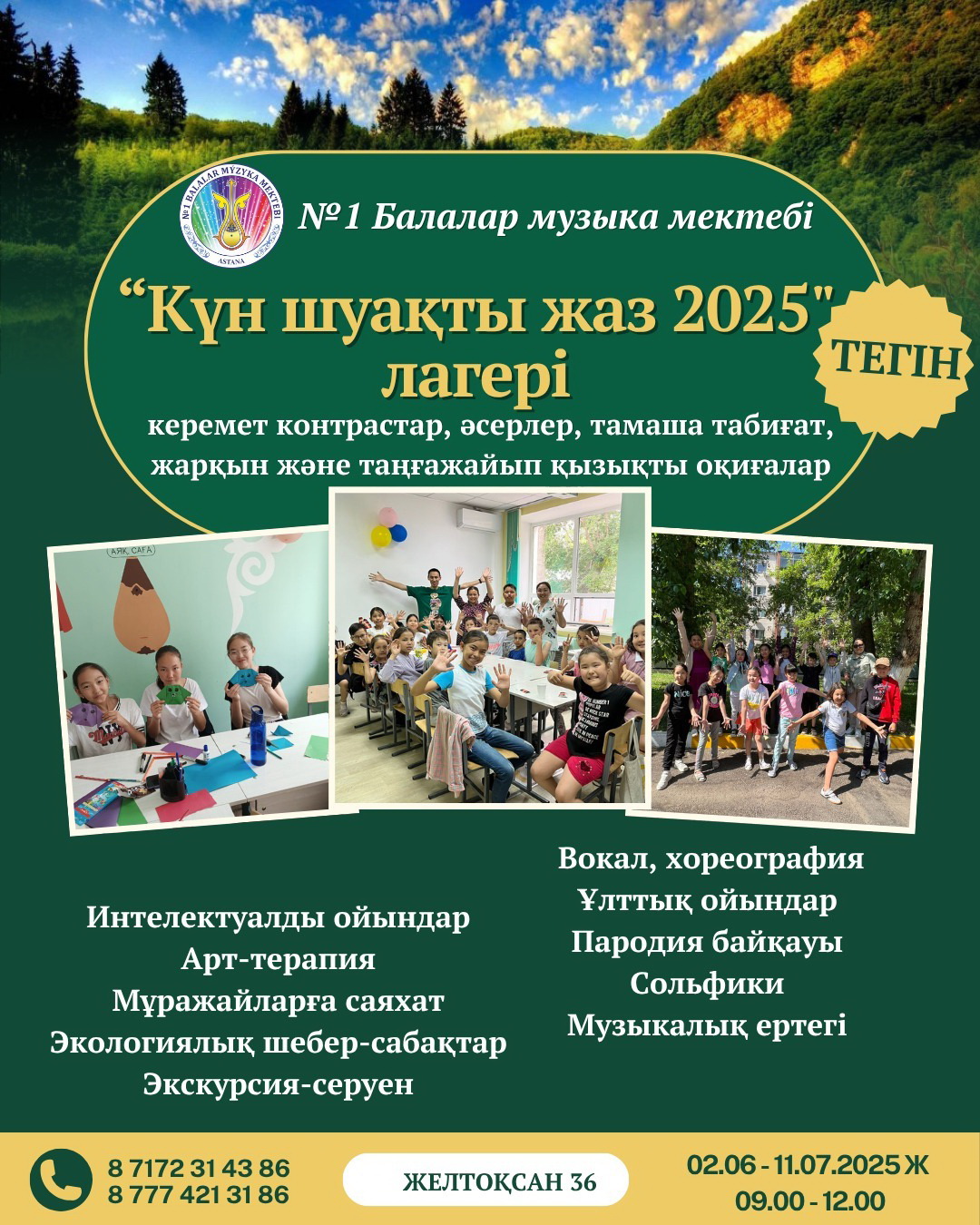 2023 жылдың 1 маусым күні балалардың жазғы демалысын тиімді және әсерлі өту үшін өнер ордамызда жазғы музыка мектебі есігін ашты. Бұл жерде балаларға танымдық, ойын-сауық бағдарламасы ұсынылады. Бағдарламада «Сольфики» хормен әндету, интеллектуалды ойындар, хореография, музыкалық ертегілер, музыкалық қонақжай және мәдени көрікті жерлерге, тетрларға экскурсияға бару жоспарланған. Және алда шілде айында өтетін «Ұлттық домбыра күні» , Астана күндері қарсаңында өтетін іс-шараларға дайындыққа қатысып уақыттарын қызықты өткізеді.